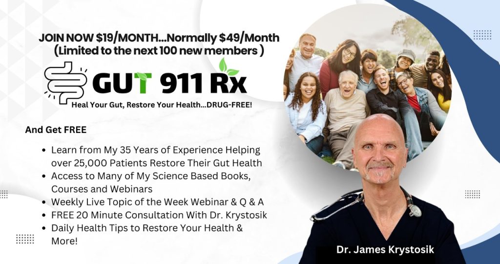 I’m Dr. James Krystosik, a functional medicine physician, chiropractor, nutritionist, author, and podcast host. Think of me as your personal doctor on-demand—whether through your phone or laptop—delivering the latest breakthroughs in gut health and research, and making it easy and enjoyable to apply in your daily life. Along with my expertise you will be connected with other like minded people on the road back to good health. Their support, encouragement and suggestions will help you reclaim your health and maintain it.